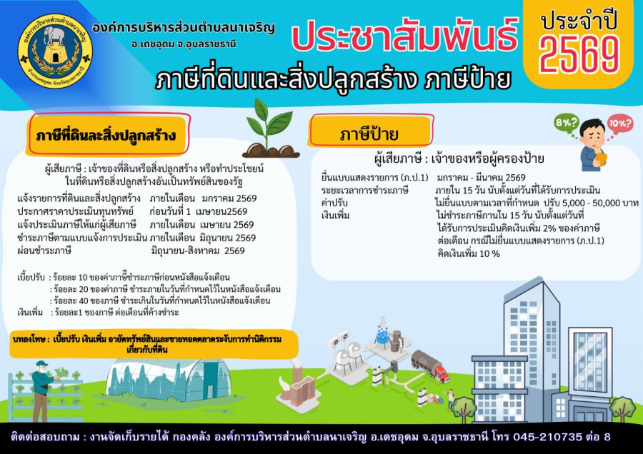 ติดต่อยื่นแบบชำระภาษีได้ที่ งานจัดเก็บรายได้ กองคลัง องค์การบริหารส่วนตำบลนาเจริญ อำเภอเดชอุดม จังหวัดอุบลราชธานี 34160. โทร. 045-210735 แฟกซ์ 045-210735 ในวันและเวลาราชการ ดังนี้