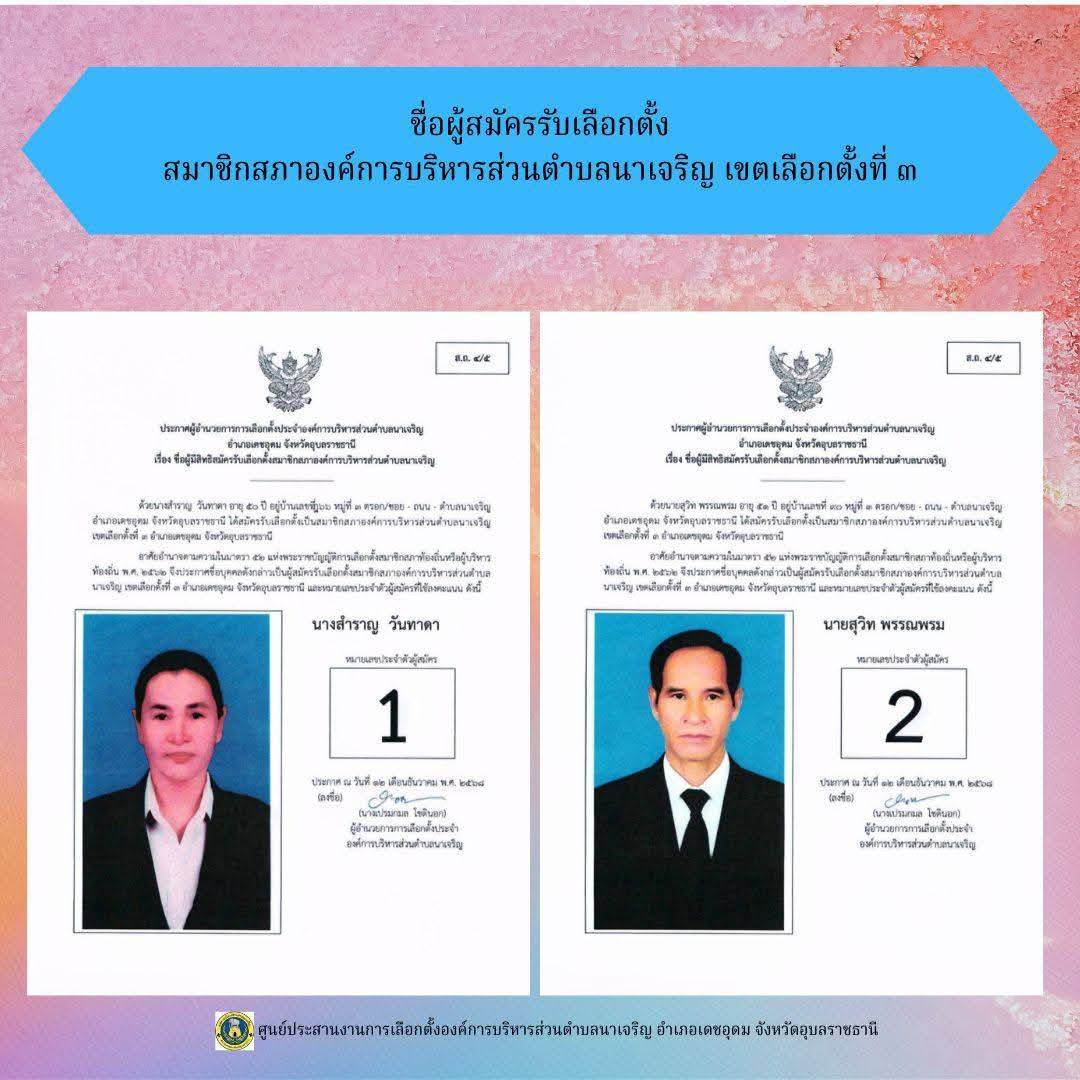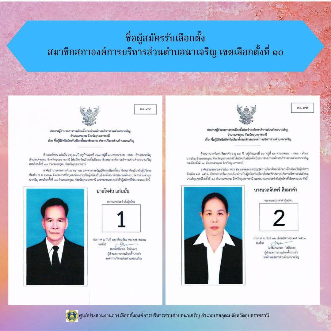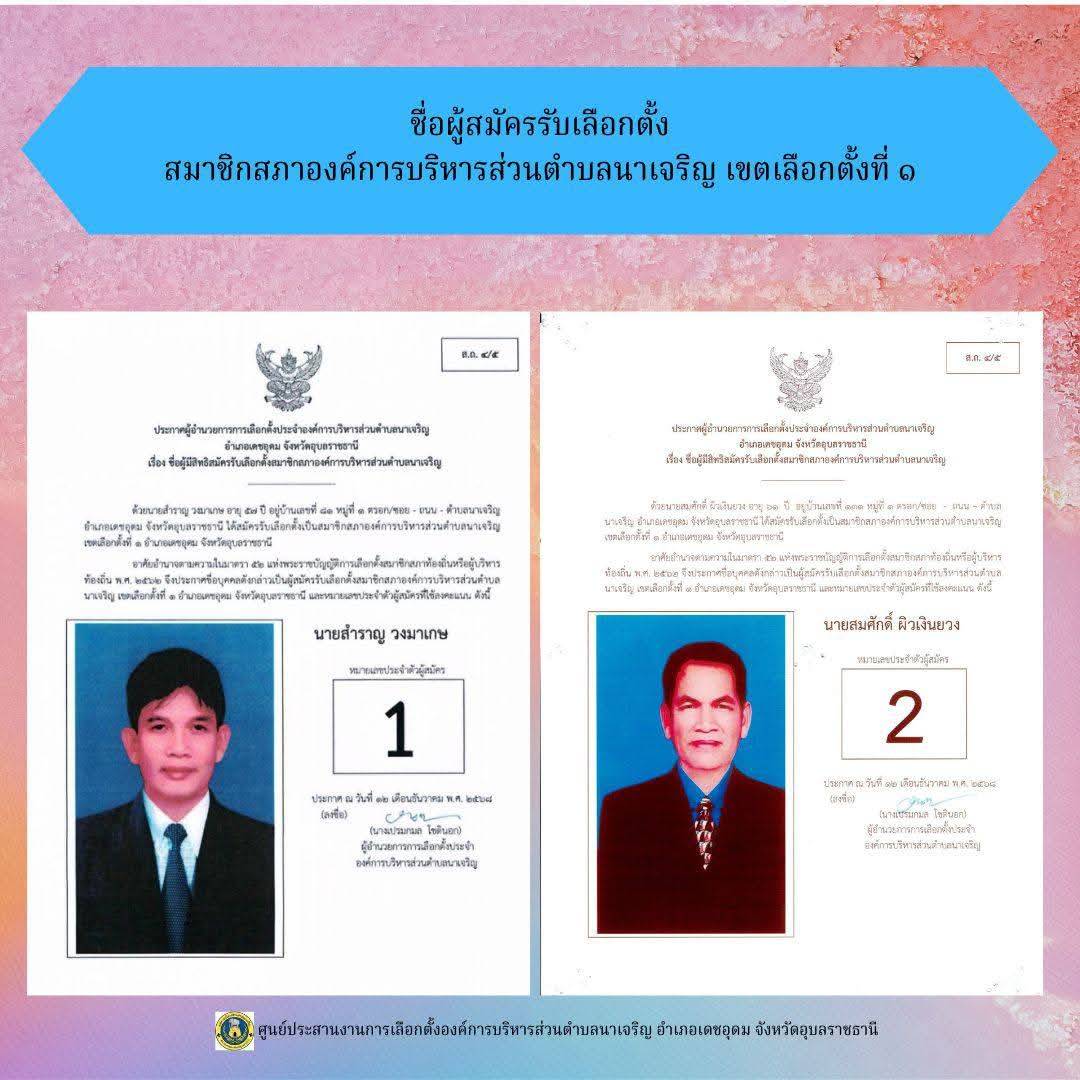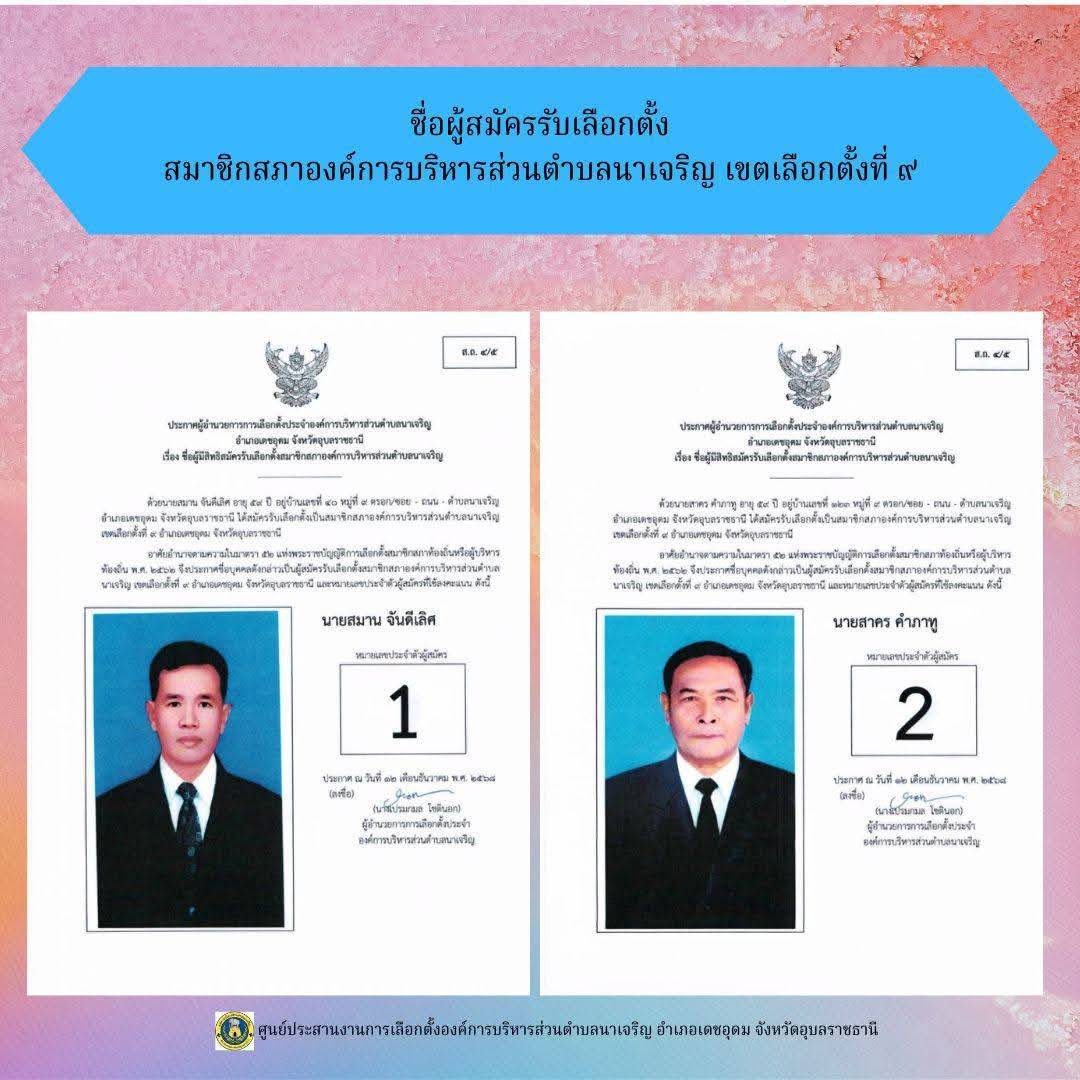 ข่าวประชาสัมพันธ์ ศูนย์ประสานงานการเลือกตั้งองค์การบริหารส่วนตำบลนาเจริญ บัญชีรายชื่อผู้สมัครรับเลือกตั้งนายกองค์การบริหารส่วนตำบลนาเจริญ และสมาชิกสภาองค์การบริหารส่วนตำบลนาเจริญ เขตเลือกตั้งที่ 1-11