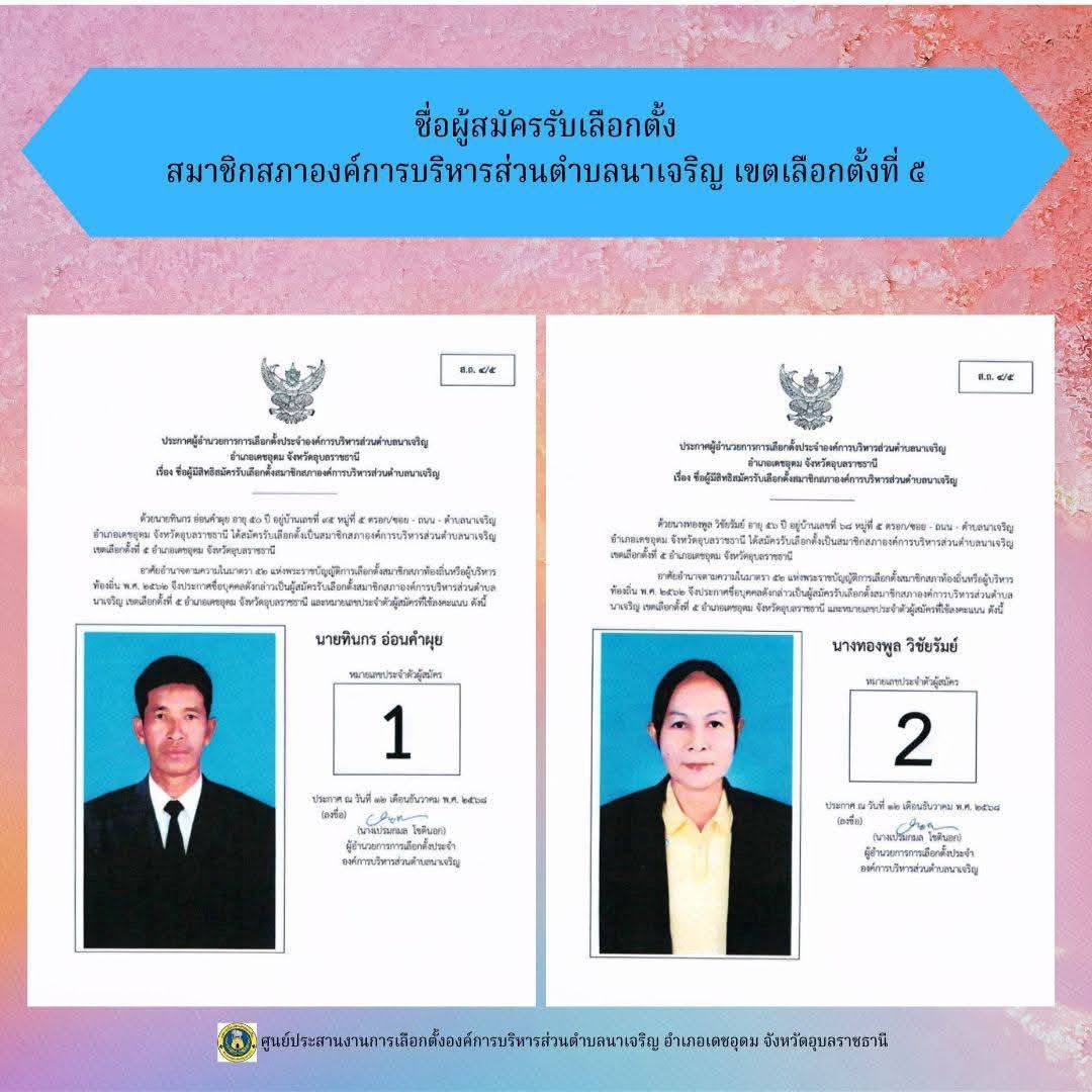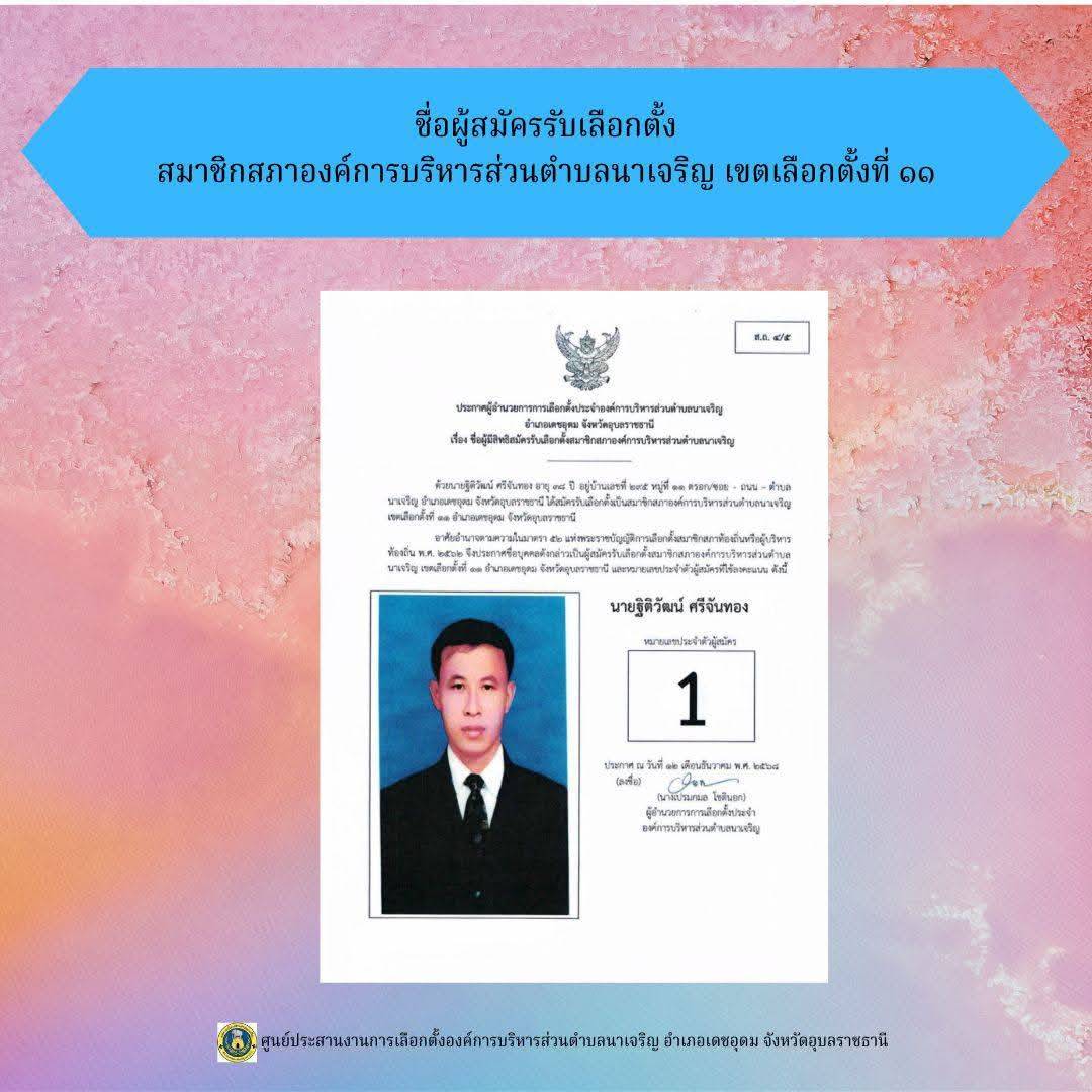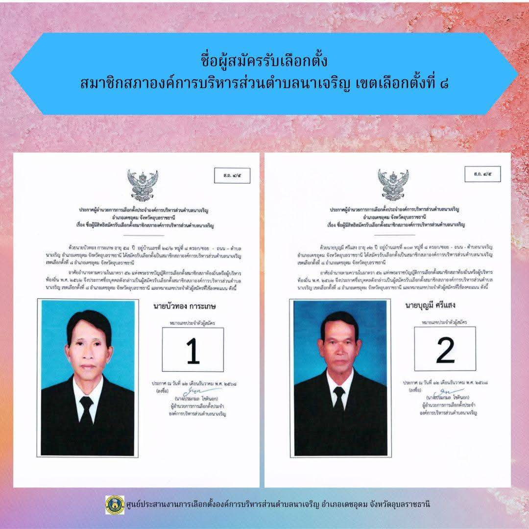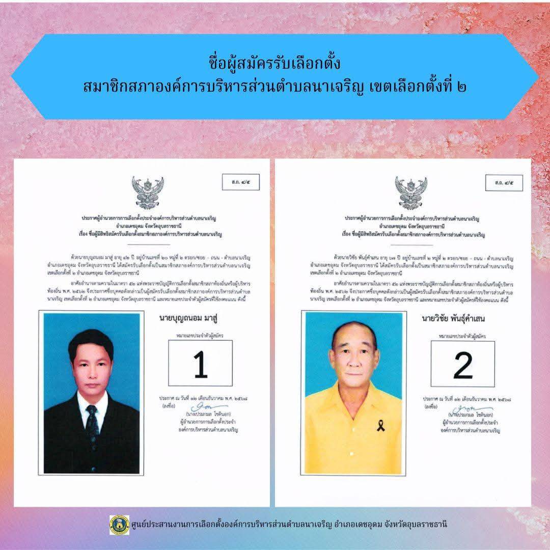 ข่าวประชาสัมพันธ์ ศูนย์ประสานงานการเลือกตั้งองค์การบริหารส่วนตำบลนาเจริญ บัญชีรายชื่อผู้สมัครรับเลือกตั้งนายกองค์การบริหารส่วนตำบลนาเจริญ และสมาชิกสภาองค์การบริหารส่วนตำบลนาเจริญ เขตเลือกตั้งที่ 1-11
