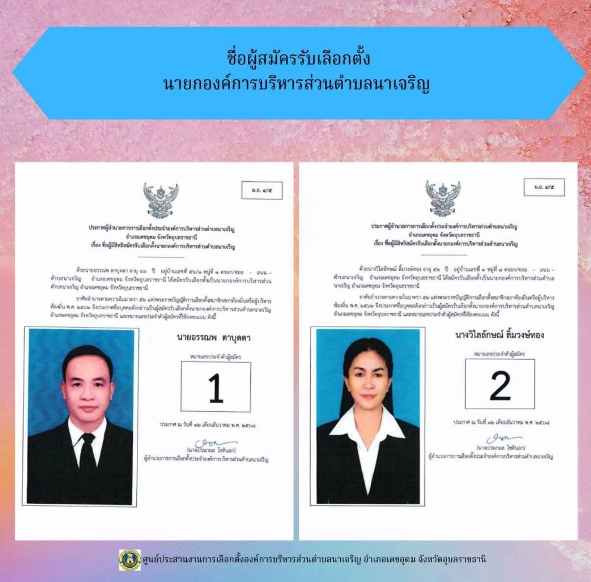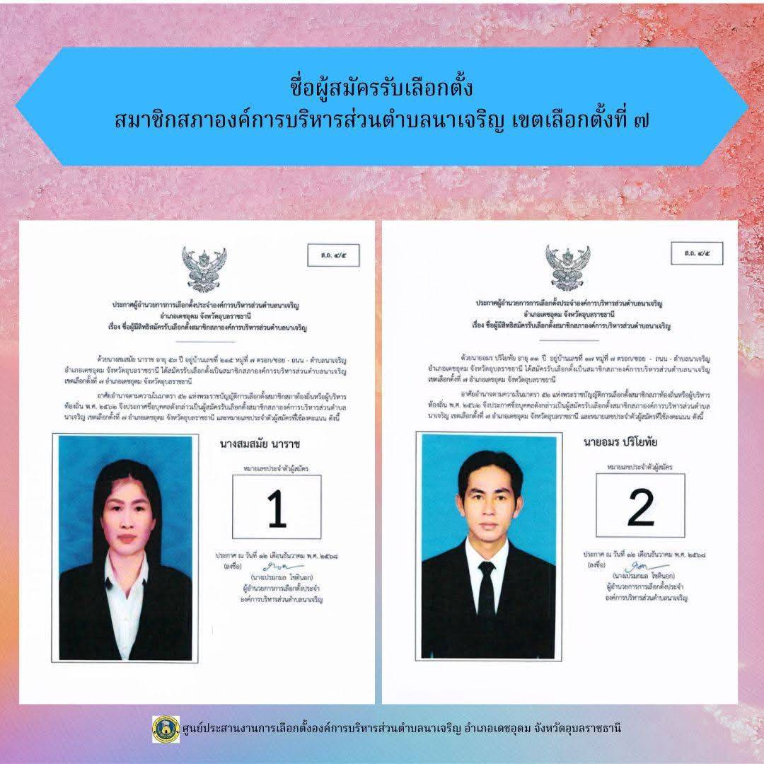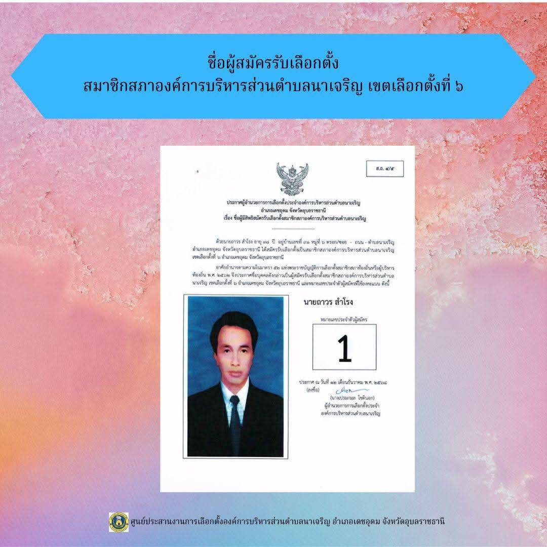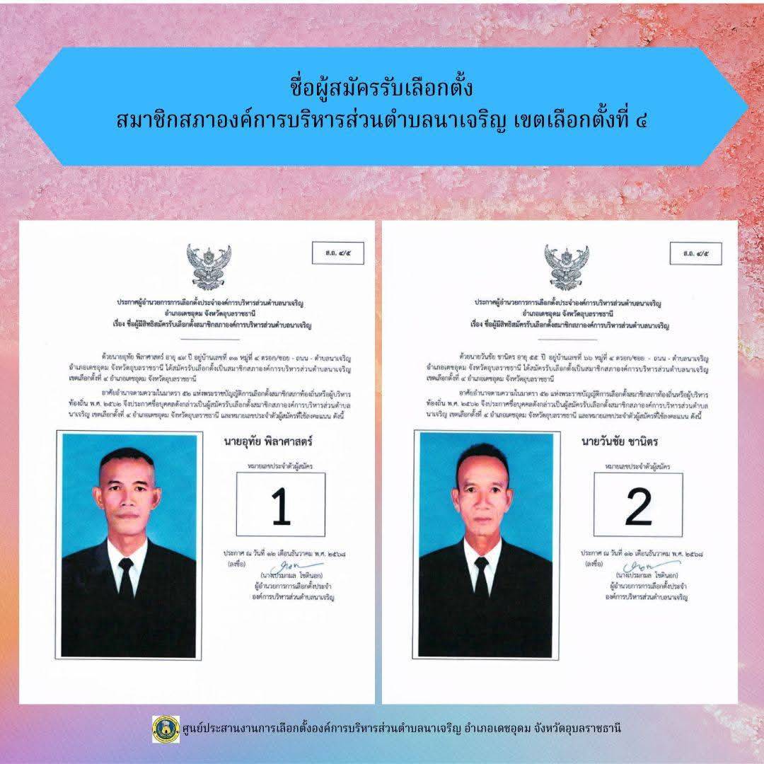 ข่าวประชาสัมพันธ์ ศูนย์ประสานงานการเลือกตั้งองค์การบริหารส่วนตำบลนาเจริญ บัญชีรายชื่อผู้สมัครรับเลือกตั้งนายกองค์การบริหารส่วนตำบลนาเจริญ และสมาชิกสภาองค์การบริหารส่วนตำบลนาเจริญ เขตเลือกตั้งที่ 1-11