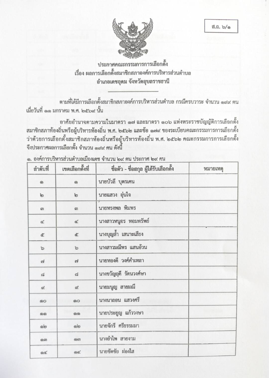 ข่าวประชาสัมพันธ์ ประกาศคณะกรรมการการเลือกตั้ง เรื่อง ผลการเลือกตั้งสมาชิกสภาองค์การบริหารส่วนตำบล อำเภอเดชอุดม จังหวัดอุบลราชธานี
